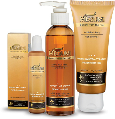 Bước 1: Ngăn rụng từ chân tóc với dầu gội Megumi – dưỡng tóc mọc dày và bồng bềnh, không chứa Silicone, Sulfate.