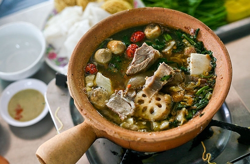2. Đổ nước vào nồi, thịt dê, gừng, hành, rượu và túi thuốc vào, đun sôi, rồi vặn nhỏ lửa hầm cho thịt chín nhừ, nêm muối, bột ngọt, tiêu bộ vào.