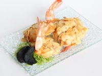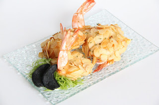 Nhúng tôm vào hỗn hợp vừa trộn rồi rắc hạnh nhân lên từng con tôm.