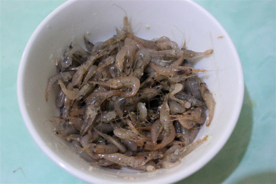 – Tép đồng nhặt bỏ tạp chất, rửa sạch lại tép sau đó ướp tép với một ít hạt nêm và muối bột canh cho ngấm gia vị.