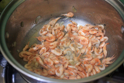 – Cho 2 thìa dầu ăn vào nồi, thêm hành khô vào xào thơm. Tiếp đó cho tép đồng vào đảo đều cho đến khi tép chuyển màu.