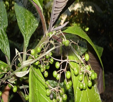 Mô tả: Cây nhỏ cao tới 2m, thân rỗng xốp, ít phân nhánh. Lá tập trung ở đầu ngọn hay các nhánh bên; phiến lá thon ngược dài 15-40cm, rộng 6-10cm, mặt trên màu lục sẫm mịn như nhung, mặt dưới màu tím đỏ, gân nổi hình mạng lưới, mép lá có răng cưa nhỏ. Hoa mọc thành chùm, dài 10-15m, màu trắng pha hồng tím gồm 5 lá đài và 3 cánh hoa. Quả mọng, khi chín màu đỏ. Hoa tháng 5-7, quả tháng 2. Phân bố: Cây mọc rải rác ở các tỉnh miền núi phía bắc và trung như: Lào Cai (Sapa), Lạng Sơn (Hữu Lüng), Quảng Ninh, Vĩnh phúcc (Tam Đảo), Hà Tây (Ba Vì), Ninh Bình (Cúc Phương), Thanh Hóa (Lang Chánh, Ngọc Lạc, Thạch Thành), Nghệ An (Qùi Châu), Quảng Trị, Thừa Thiên Huế (Phú Lộc), Quảng Nam – Đà Nẵng.