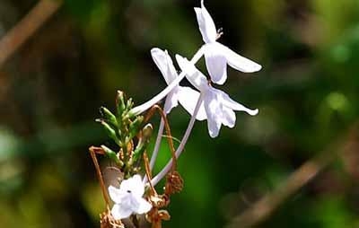 Về mùa xuân, cây ra hoa thành từng chùm ở cuối cành, cuống hoa ngắn, ống hoa dài, tán hoa có 4 cánh nhỏ màu trắng tím nhạt, không thấy quả. Thân cây già màu xám nâu, rễ mọc chùm không có rễ cái.
