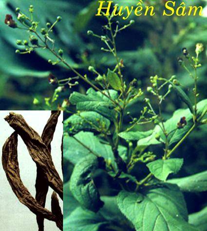 1- Quảng huyền sâm (Scrophularia ningpoensis Hemsl) là cây thân cỏ sống lâu năm. Mặt sau lá và trên cây non có lông ngắn mọc chi chít, thân cây hình vuông, cao độ 1-1,7m. Lá mọc đối, có cuống, hình trứng hẹp, đầu nhọn, có cuống rộng hơn cuống lá Thổ huyền sâm m p lá có răng cưa đều đặn, lá cüng dầy hơn lá Thổ huyền sâm. Về mùa hè cây ra hoa, tụ họp thành chùy trìn, phần ống tràng giống như chiếc tách, rìa cánh hình môi, màu tím đỏ, 4 nhị đực, 1 nhị cái. Quả bế đôi nhỏ, hình trứng. Rễ củ tương đối to mập, hình búa, vỏ màu nâu xám ruột trắng sau khi chế biến khô thì tự trở thành màu nâu đen.