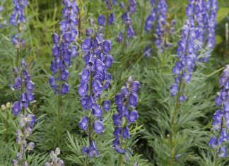 Hoa lưỡng tính, không đều, hoa có màu xanh lơ thẫm hay tím mọc thành chùm ở ngọn thân. Có 5 lá đài, trong đó có một cái khum thành hình mũ: Quả có 5 đại mỏng.