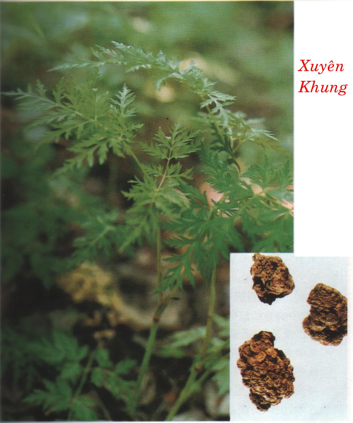Họ khoa học: Họ Hoa tán – Umbelliferae (Apiaceae) Mô tả: Xuyên khung là 1 loại cây thảo, sống lâu năm. Thân mọc thẳng, giữa ruột rỗng, mặt ngoài có đường gân dọc. Lá mọc so le, kép 2-3 lần, lá chét có 3-5 đôi, cuống dài, phiến lá rách sâu, khi dùng tay vò ra có mùi thơm, cuống lá dài 9-17cm, phía dưới ôm lấy thân. Hoa họp thành tán kép, cuống tán phụ ngắn chừng 1cm, hoa nhỏ, mầu trắng. Quả loại song bế, hình trứng. Thu hái: Cây trồng sau 2 năm mới bắt đầu thu hoạch.