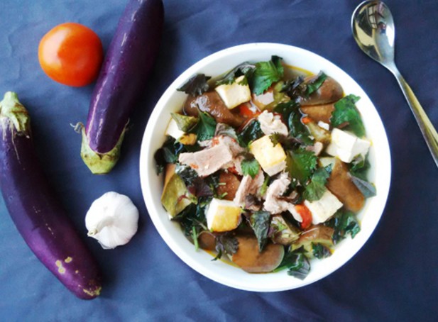 Canh gà, cà tím: Gà giò 1 con, cà tím 200g, sơn tra 15g, gừng 5g, hành 10g, dầu, muối một lượng thích hợp. Gà làm sạch, bỏ nội tạng; cà tím rửa sạch, cắt miếng, gừng cắt lát; hành cắt khúc. Để nồi nóng đổ dầu vào, cho gừng, hành vào phi thơm bỏ gà vào xào sơ. Tiếp đó, đổ nước vào, bỏ cà, sơn tra, muối vào, nấu sôi bằng lửa lớn, sau đó vặn lửa nhỏ nấu thêm chừng 30 phút là được. Mỗi ngày ăn một lần, dùng thay thức ăn. Có tác dụng tiêu thực tan ứ, giảm mỡ, hạ huyết áp.