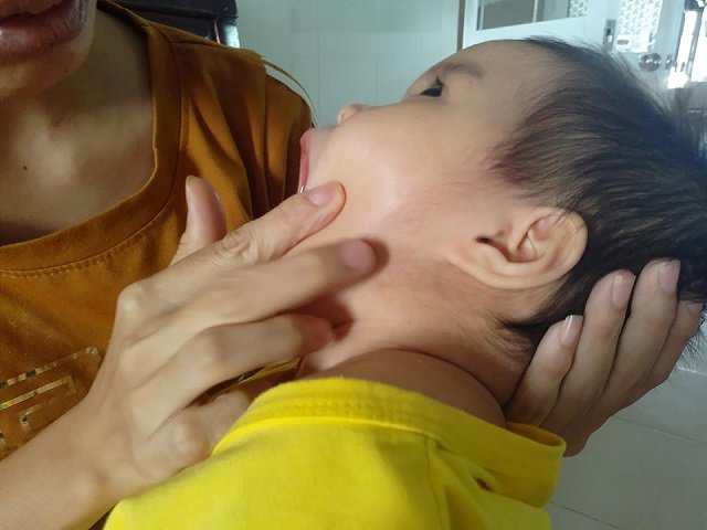 Ôm con trong vòng tay, anh Bùi Văn Hướng (sinh năm 1988, bố cháu Bảo An) kể lại, vào khoảng giữa tháng 6/2017, con anh bị côn trùng đốt vào vành tai phía bên phải. Khi con mới bị đốt vợ chồng anh phát hiện ra ngay, nhưng chỉ nghĩ là muỗi đốt rồi sẽ khỏi nên không để ý.