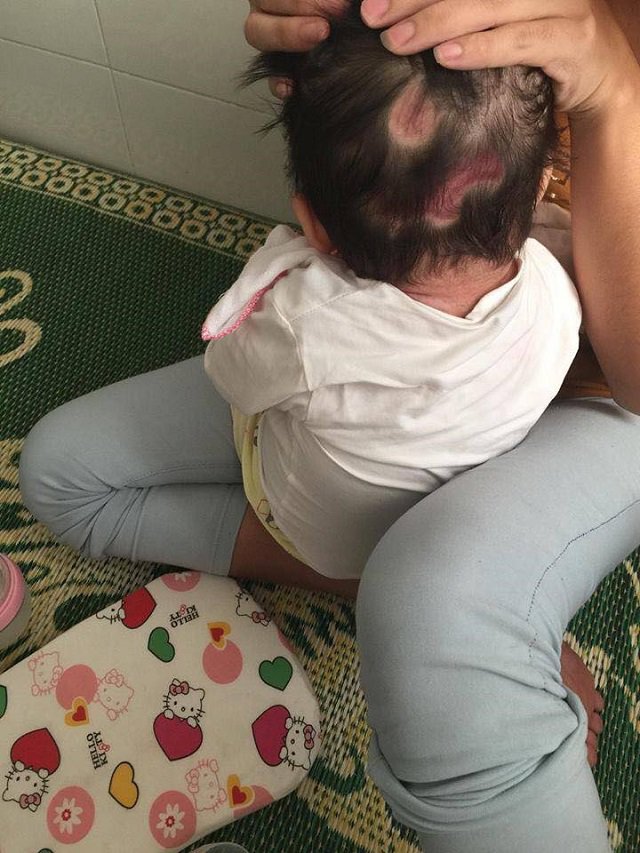 Do nằm một chỗ lâu, bé Bảo An bị bong tróc da đầu.