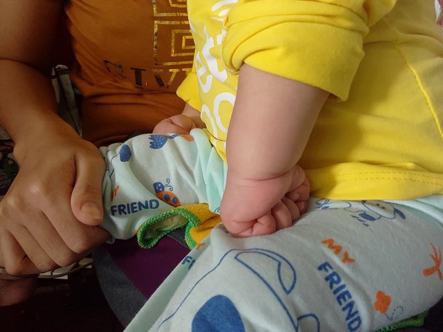 Chân tay bé Bảo An bị co quắp do ảnh hưởng từ teo não.