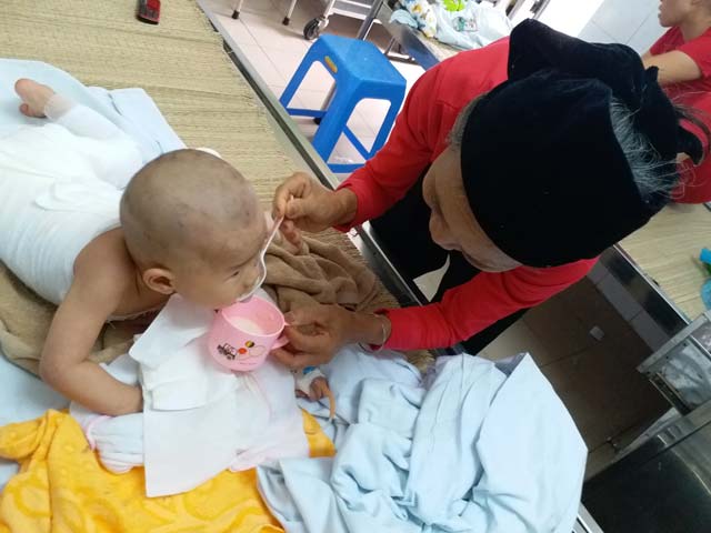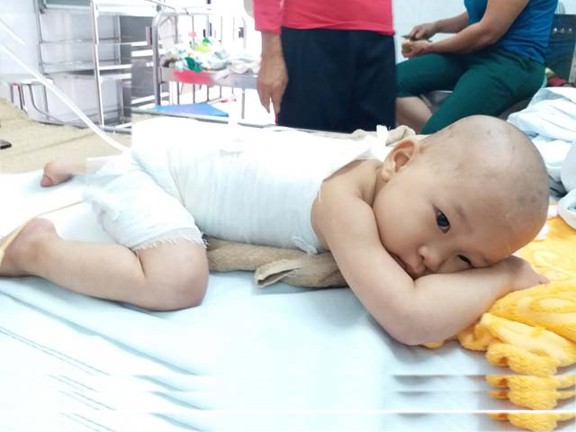 Đang nằm điều trị tại khoa Bỏng trẻ em Viện Bỏng quốc gia, cháu Triệu Thùy Nhâm (16 tháng tuổi) luôn ở trong tư thế nằm sấp từ lúc ngủ cho đến lúc ăn vì những vết bỏng trên khắp cơ thể.