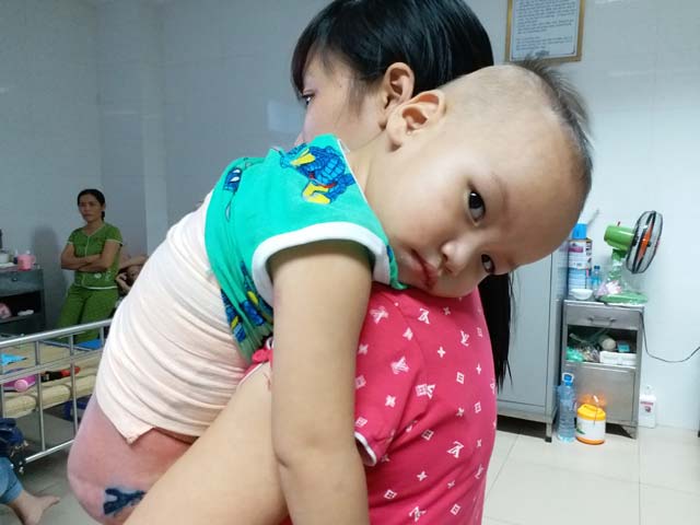 Hơn 1 tháng điều trị tại Viện Bỏng Quốc gia, cháu Đinh Việt Hoàng (21 tháng tuổi, ở Mỹ Đức – Hà Nội) dù đã qua cơn nguy kịch, nhưng những vết bỏng do ngã vào nồi nước sôi vẫn chưa liền lại.