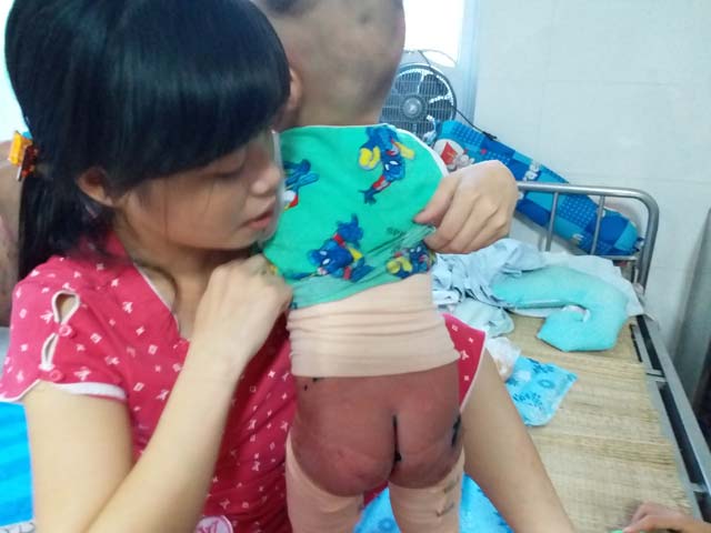 Cháu Hưng đau đớn vì vết bỏng đang ăn da non và bị sẹo lồi.