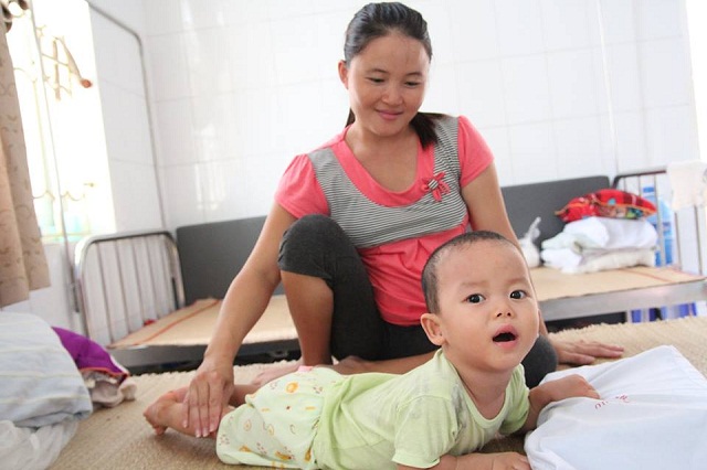 Đang điều trị tại Bệnh viện Châm cứu Trung ương, chị Nguyễn Thị Thu Hoài (sinh năm 1992, ở Hà Tĩnh) hàng ngày phải cùng các bác sĩ trị liệu cho con.