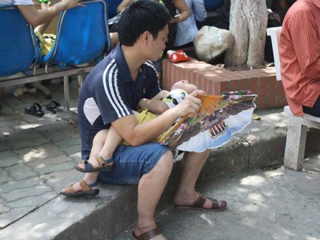 Nhiều bệnh nhi chờ đến lượt khám dưới thời tiết nắng nóng.